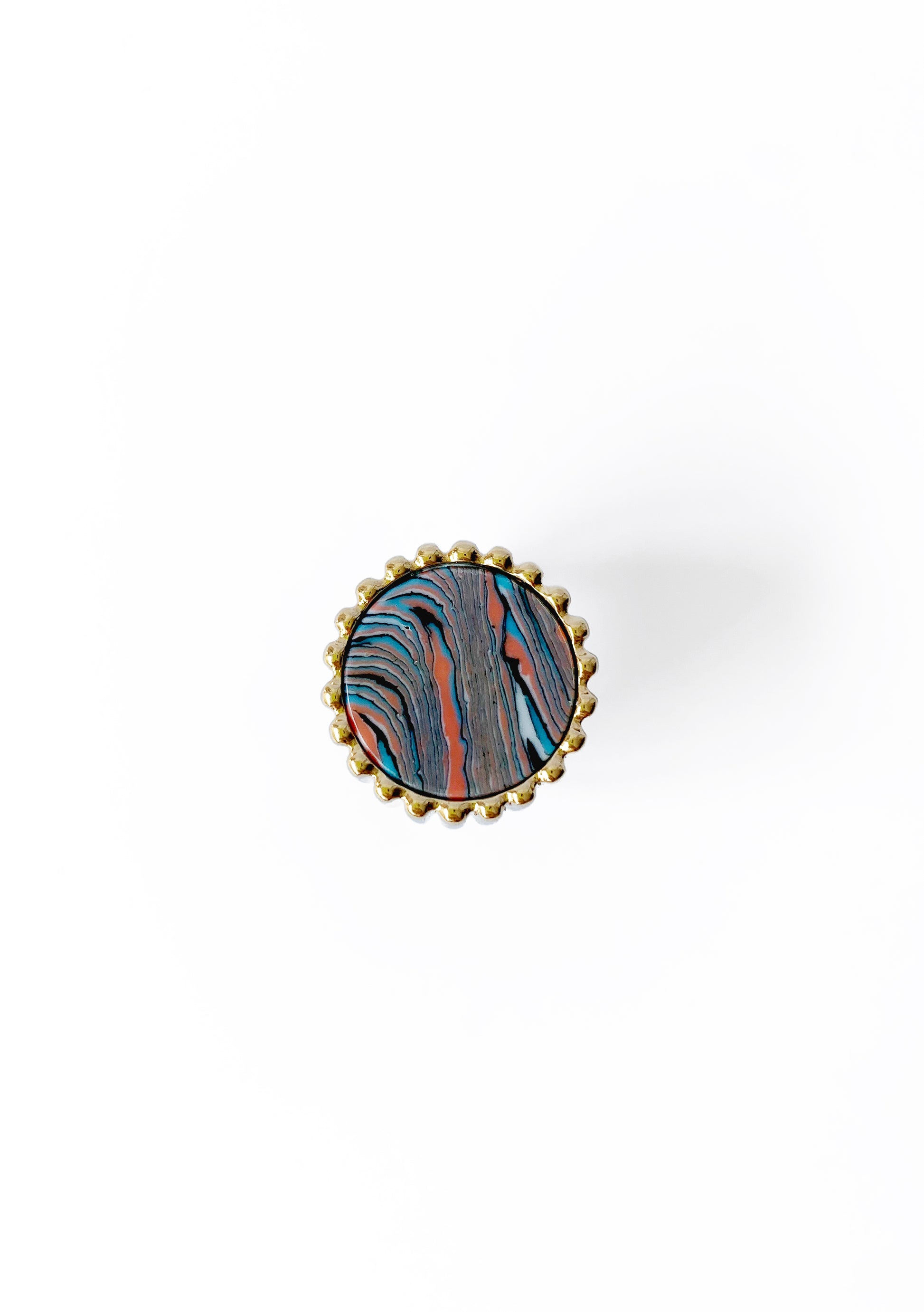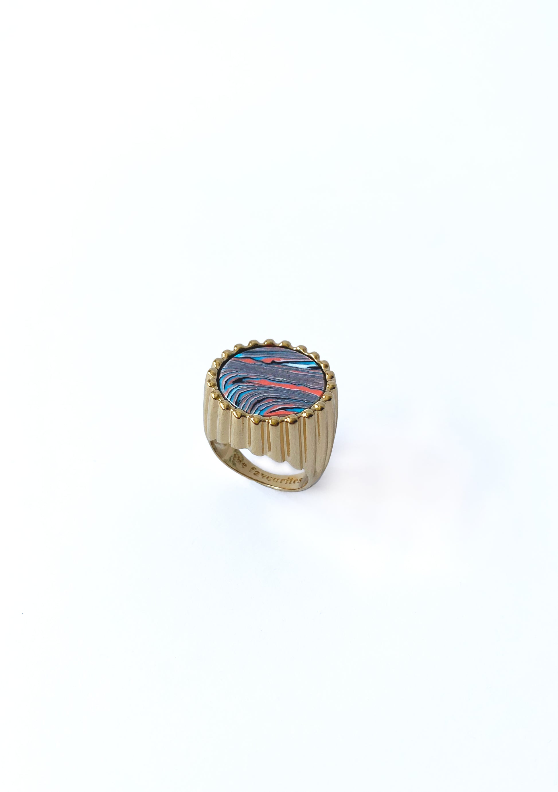 Sello con forma de bombón, estriado y coronado por una piedra "reconstituida". Piedra modelada con restos de pigmentos azules, naranjas y otras piedras. Con patrones diversos, ondulantes e hipnóticos porque cada piedra tiene un patrón diferente. Reutilizamos para el medioambiente y para crear nuevas texturas. La base de esta pieza es latón bañado en oro de 18K y dos micras de oro.